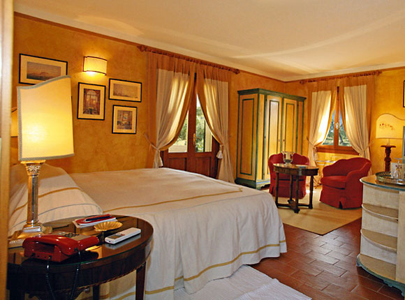 Guest accommodation is available in just twelve romantic bedrooms and a suite, each of which decorated in traditional country style, with floors in parquet or terracotta, spacious sitting areas, and luxurious bathrooms in red Verona marble.